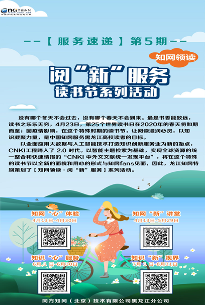 4月23日,第25个世界读书日在2020年的春天将如期而至。因疫情影响,中国知网在这个特殊的读书节以全新的面貌和用心的形式与知网fans见面。因此,龙江知网特别策划了【知网领读•阅“新”服务】系列活动。欢迎我院师生积极参加活动,具体事宜见附件。