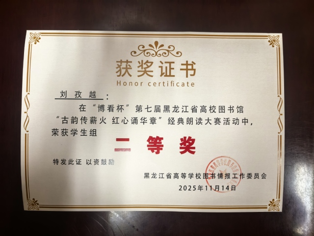 近日,第七届博看杯黑龙江省高等学校图书馆“古韵传薪火红心诵华章”经典朗读活动圆满结束。本次经典朗读活动自启动以来,受到了学生们的广泛关注,其中我校有5名同学进入决赛,经专家评审最终我校刘孜越同学获得学生组二等奖的好成绩。