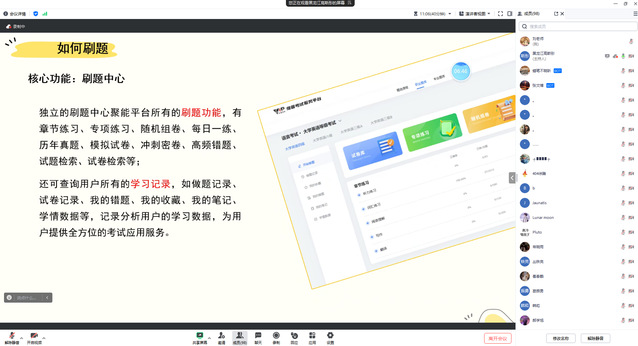 本次讲座通过腾讯会议平台开展,共吸引约百名学生参与。讲座中,讲师系统介绍了“维普智图考试服务平台”的核心功能。该平台整合了海量试题资源,提供包括试卷库练习、专项随机组卷、高频错题回顾、历年真题实战等在内的多元刷题模式。平台还支持智能错题管理,自动收录错题并按出错频率排序,帮助学生精准定位复习重点。