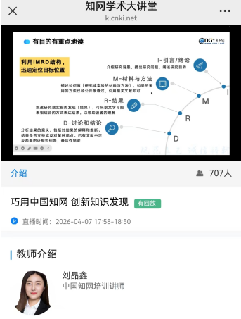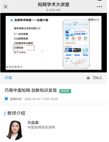 本次讲座,图书馆邀请中国知网高级讲师刘晶鑫担任主讲,通过中国知网在线教学平台进行直播。讲座以“巧用中国知网 创新知识发现”为主题,详细介绍了中国知网数据库的基本功能,并重点讲解了“文献检索与筛选策略”“文献阅读方法与管理方式”“全球学术快报APP”等模块的功能特点与使用方法。
